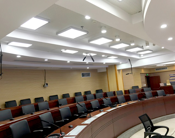 为了满足会议转播时画面清晰、无阴影的照明要求,最后选用NFC9166 LED平板灯为应急指挥中心提供照明。NFC9166 LED平板灯无频闪,照度均匀,视频传输时,画面中的人脸清晰可见,满足视频会议高清转播的照明要求。根据现场会议室天花吊顶情况,分别采用了明装和暗装两种安装方式,总共布置灯具76套(主会场67套,机房7套,通讯设备间2套)。